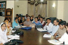 A group of 26 students from the departments of Defense and Strategic Studies and International Relations in Quaid-e-Azam University (QAU), Islamabad visited the Pak Institute for Peace Studies (PIPS) on October 21, 2008. They were briefed about the PIPS research initiatives in conflict and peace areas, PIPS Database, PIPS Archives and PIPS team. Ms Shabana Fayaz, Assistant Professor at the QAU, had arranged and led the delegation of students.