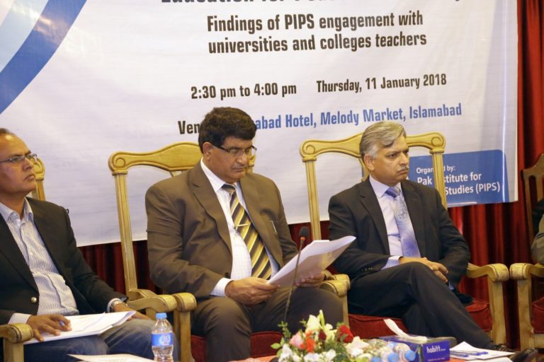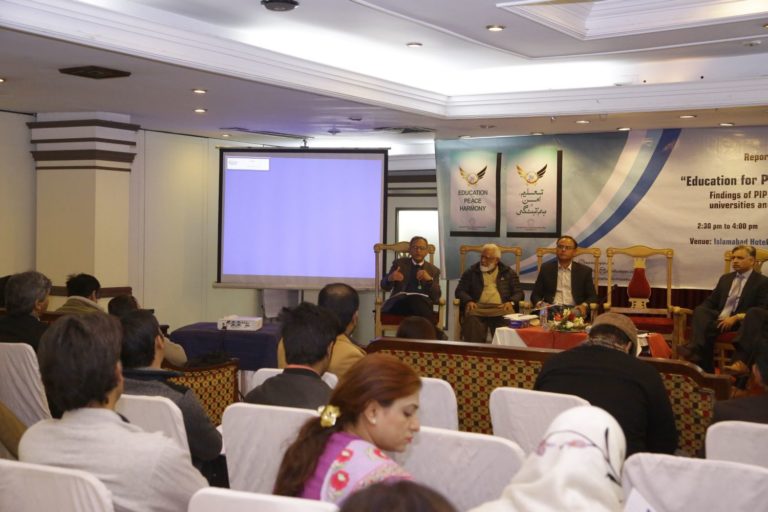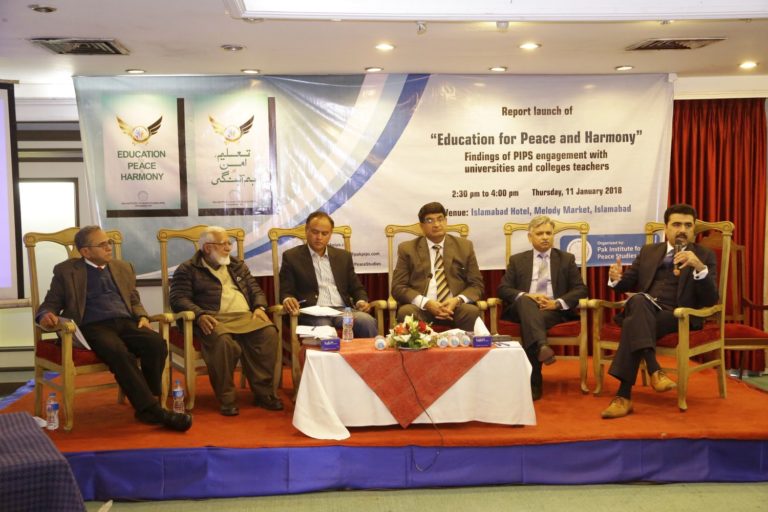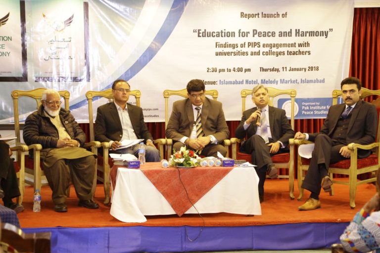 Speakers shared these observations at the launching ceremony of a recent PIPS report “Education for Peace and Harmony,” held in Islamabad on January 11, 2018. Director General of Islamic Research Institute, Dr. Muhammad Ziaul Haq presided over and chaired the event. Among the keynote speakers were former chairperson of Council of Islamic Ideology (CII) Dr. Khalid Masood, educationist Professor A.H. Nayyar, scholar and a CII member Khurshid Nadeem, columnist Yasir Pirzada, and peace activist Rashad Bukhari.