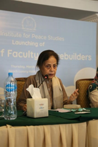 Prof. Dr Khalida Ghaus, a well-known scholar and educationist, shared that in her 36 years long career, she failed to understand the role our teachers are playing for we have failed in building a nation in this country. She held that when we discuss radicalization in our campuses, our focus should not be students alone as teachers are also part of the same society and have clearly been radicalized. She also criticized the absence of public spaces for educated voices in the country. Speaking on the importance of the role of a teacher, Dr. Khalida held that while curricula can give a defined set of knowledge to the students, they need teachers to gain wisdom and a rational mind. She held that while a value system is important, one must be clear on the foundation of these values. In our attempt to propagate a particular set of values based on one religion, we fail to respect diversity of values in a society.